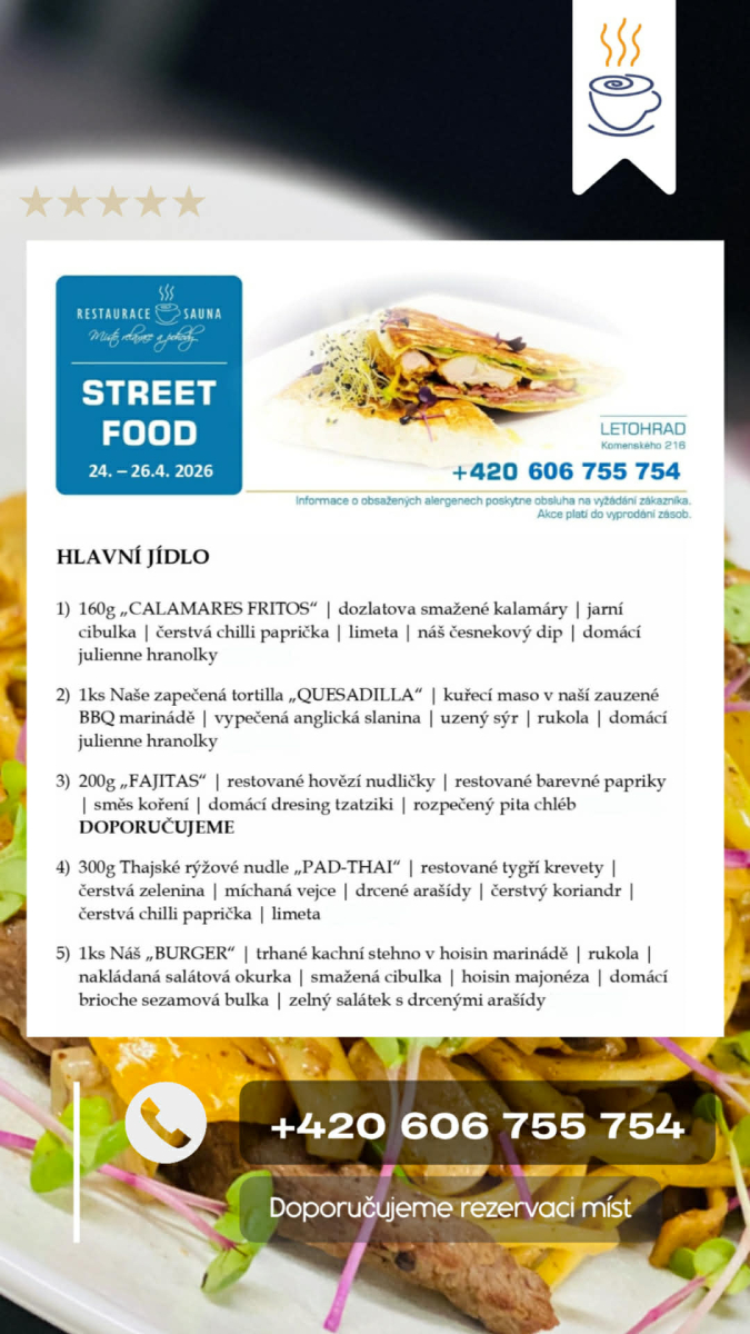 Smažené kalamáry, burger s trhaným kachním masem, Pad Thai rýžové nudle nebo hovězí Fajitas – to je jen malá ochutnávka toho, co Vás čeká!
