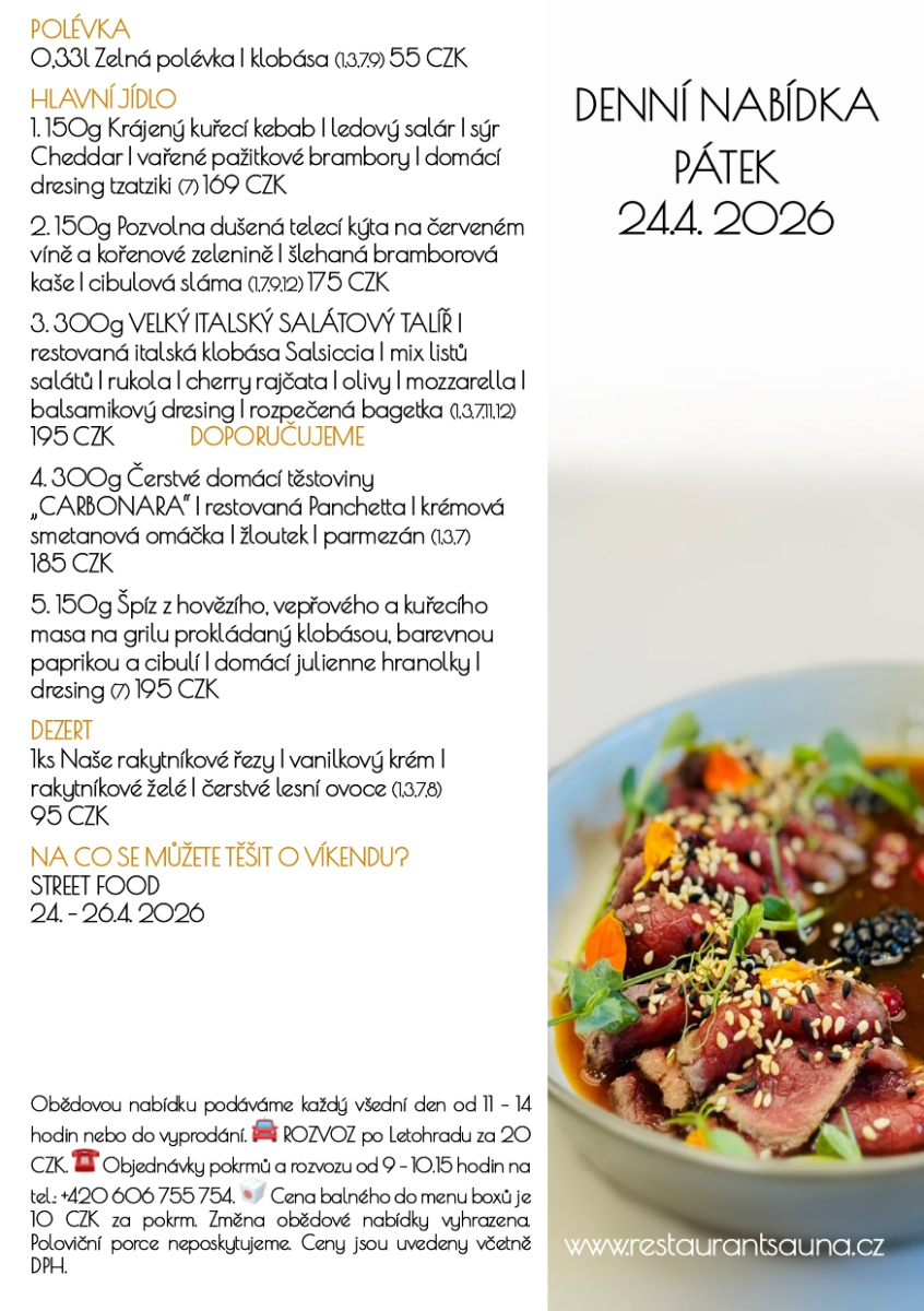 ● ROZVOZ - Rozvoz obědové nabídky po Letohradu a Dolní dobrouč s příplatkem 20 CZK. Obejdnávky od 9 do 10.15 hodin. Doporučujeme včasnou objednávku. Kapacita rozvozů či počet porcí pokrmů je omezen.