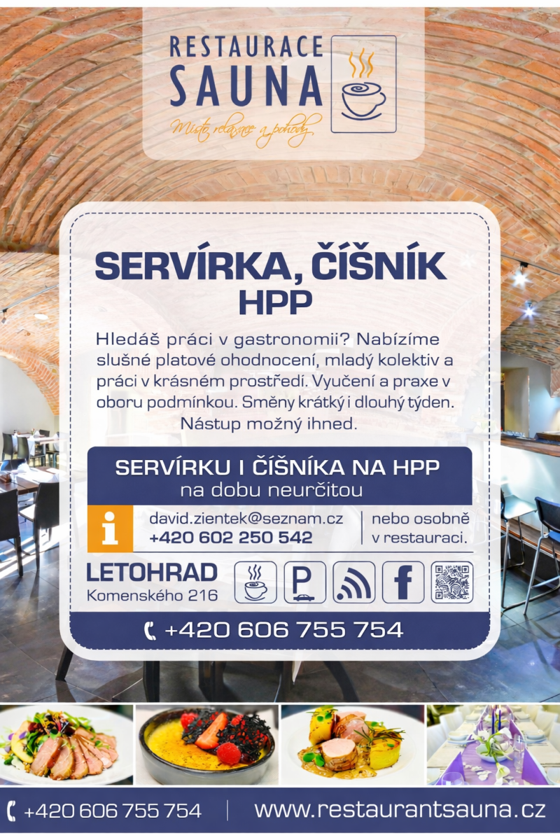 Do naší Restaurace Sauna v Letohradě hledáme servírku nebo číšníka na HPP.